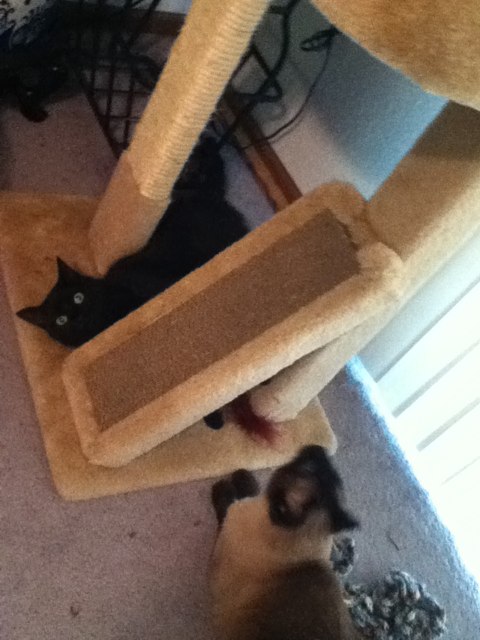 We are fortunate to have a large scratching post to play, sleep, and to scratch on. I think mommy and daddy likes it to cause them we don't scratch their furniture.